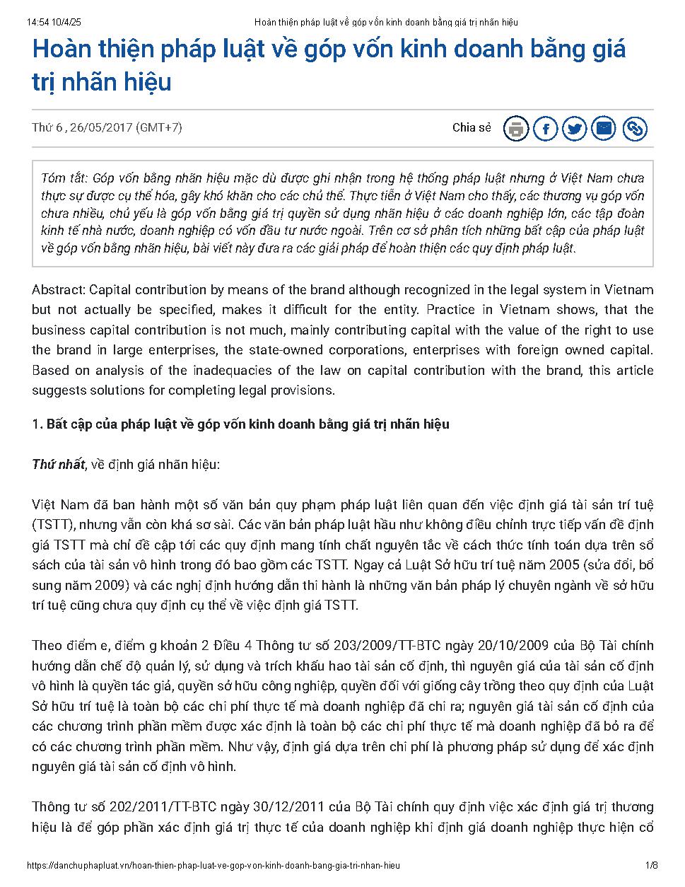 Hoàn thiện pháp luật về góp vốn kinh doanh bằng giá trị nhãn hiệu